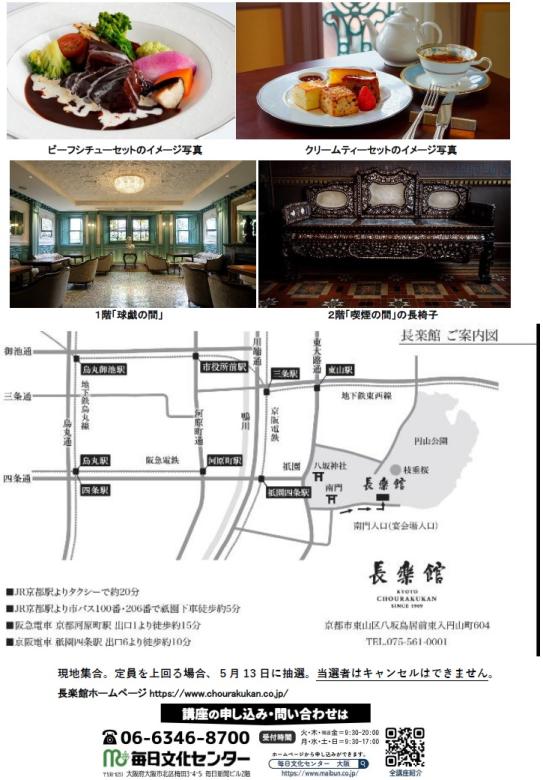 長楽館は“煙草王”村 井吉兵衛が建てた豪奢 な迎賓館です。 【日 時】 2026年 6月3日(水) 10:00~11:20、その後お食事 【受講料+食事】 (入会金不要・要予約) 。 1.クリームティーセット付 6,600円 スコーン2種(プレーン&クランベリー)・パウ ンドケーキ・ヴィクトリアケーキ・飲み物 (コーヒーもしくは紅茶) 2.ビーフシチューセット付 8,800円 ビーフシチュー・サラダ・パン・飲み物 (コーヒーもしくは紅茶) 『モダン建築の室内意 匠と家具-新島襄旧 邸・長楽館・大丸ヴィ ラのインテリア-』の 執筆や長楽館の調査で 得た内容を、通常非公 開の3階を含めてガ イドします。
