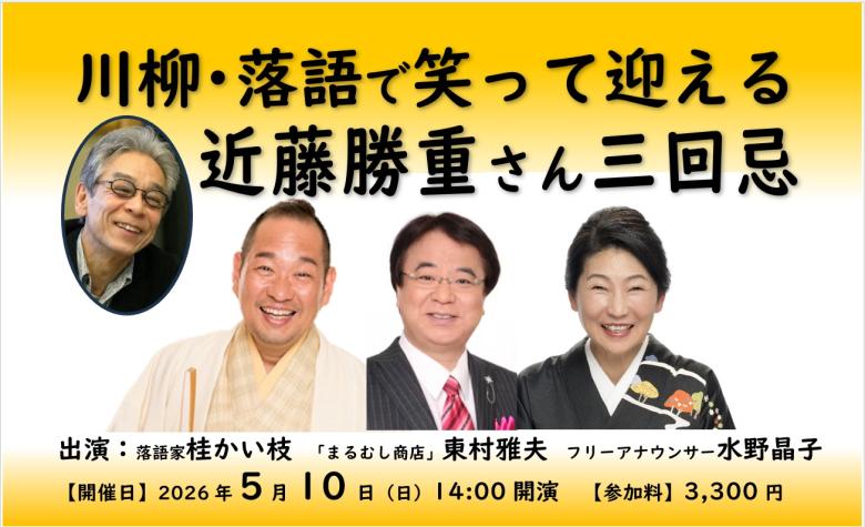 Newおすすめ入会金不要2024年5月10日に急逝したジャーナリスト近藤勝重さん。 40年もの間、毎日放送の様々な番組に出演、とりわけ「しあわせの五七五」川柳師範として多くのリスナーに愛されていました。また、毎日新聞健康川柳の選者としても、読者に親しまれ続けた存在でした。 今回は、近藤さんと長く番組で共演した桂かい枝さん、そして「しあわせの五七五」の後継番組「まるっと!しあわせ川柳」パーソナリティである「まるむし商店」東村雅夫さんを迎えて、落語と川柳で笑いの空間を創りだし、近藤さんが生前語っていた「楽しいから笑うのではなく、笑うから楽しくなる」を実践します。 「思い出トーク」「川柳コーナー」「落語」など盛りだくさんの内容でお届けしますので、一緒に笑って楽しく、近藤勝重さんを偲びませんか。 【参加要項】 ★「近藤勝重さん」をテーマに、できれば一句お書きください 事前に右の二次元コード(QRコード)より投句してください 「近藤勝重さん三回忌」投句フォーム ←ここをクリックしてください。 ※投句フォームより投句が上手く行かない方や、事前の作句が難しい方は、当日までにお考えください。 当日記入できる紙もご用意します。 【持参品】筆記用具 ★お申し込み方法★ 2026年3月7日(土)受付開始 お申し込みボタンを押していただくと、Pass Marketという外部サイトに移行します。 Pass Marketからのお申し込みは、ラジオ放送中の3月7日朝5時から(24時間対応)できます。 Pass Market以外のお申し込み方法 (毎日文化センターの営業時間は、9:30~17:00、火・木・隔週金曜は20:00) ・お電話 or FAX (郵便局の払込用紙を送ります) ・毎日文化センター受付でも承ります(受付でのお支払いは現金のみ)